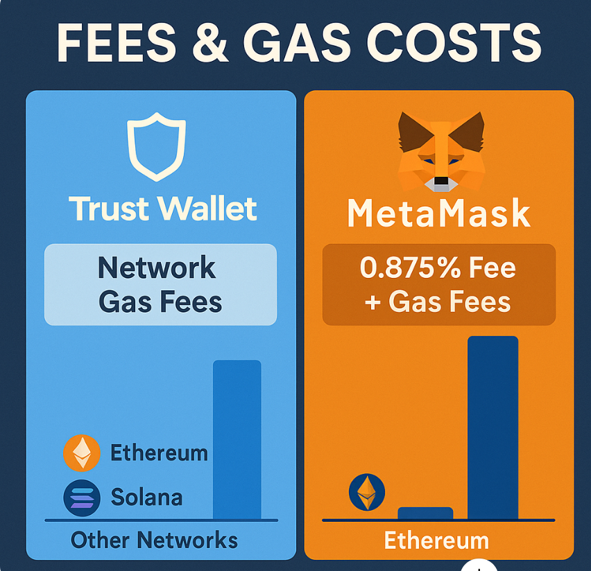 Both require users to pay network gas fees in the form of transactions, swaps and staking. MetaMask imposes a 0.875% swap fee and this can make it more costly to transact. There are no swap fees in addition to any gas fees for transaction on the blockchain that users need to pay. Gas fees on Ethereum are much higher in contrast to some other networks, which is available through Trust Wallet such as Solana and Avalanche, which could be cheaper.
